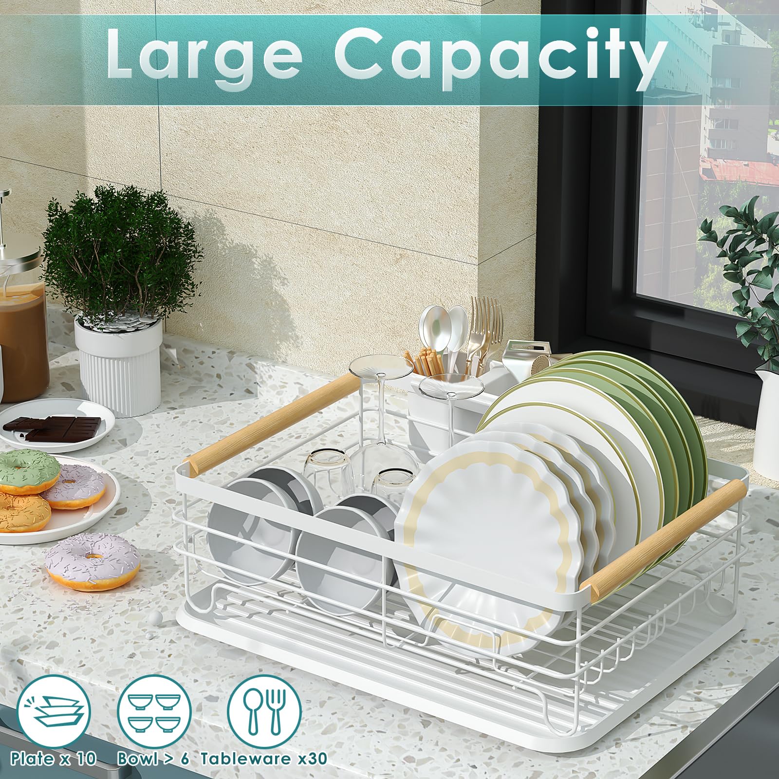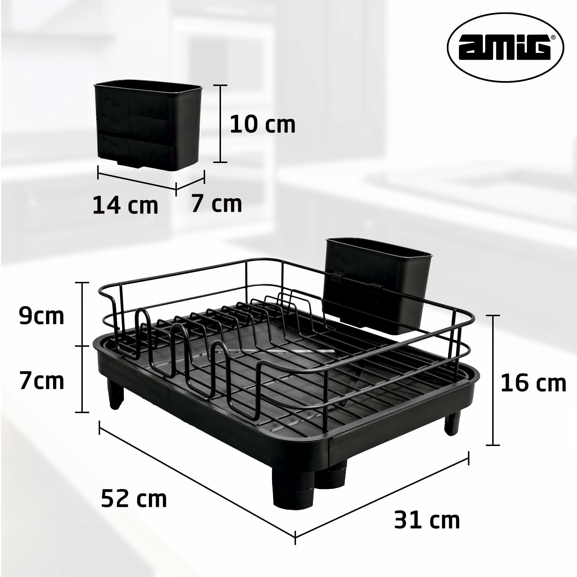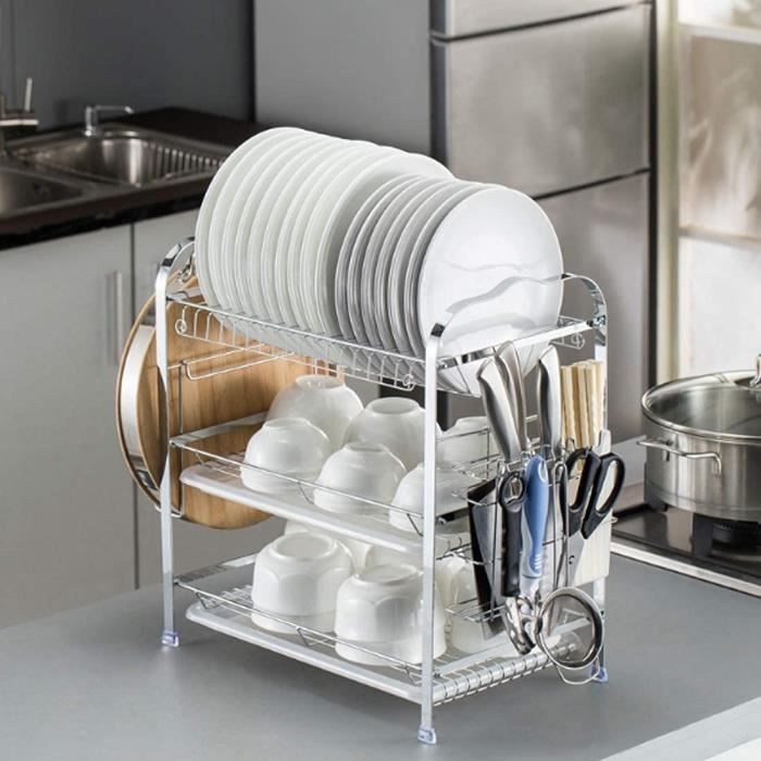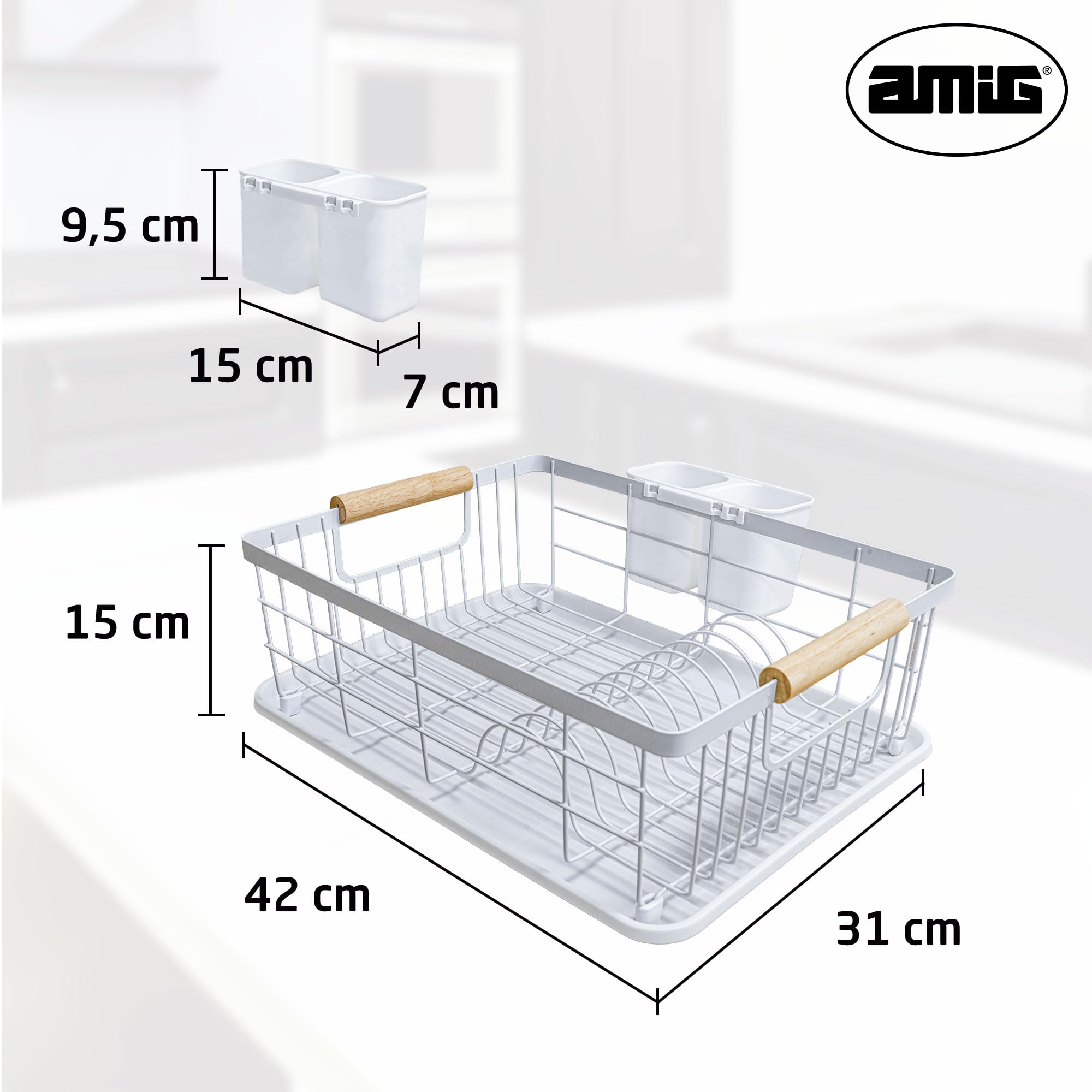 Pour une cuisine bien rangée, cet égouttoir Amig Graz est top ! Dimensions 42x31,5x15cm, en acier blanc avec poignées en bois. Bac d'égouttement amovible pour éviter les flaques, support à couverts amovible aussi. Capacité : environ 10 assiettes et 6 verres. Design scandinave, facile à nettoyer. Si vous avez un petit évier, ou si vous voulez un égouttoir esthétique qui ne fait pas 'cuisine étudiante', ce modèle est idéal. Qualité Amig, durable. Les propriétaires soigneux l'apprécient pour son look et sa fonctionnalité.