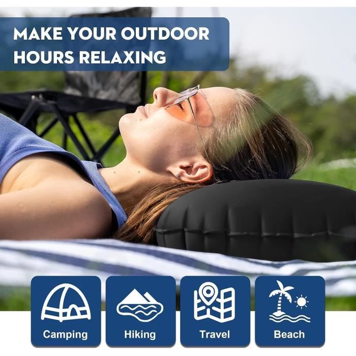 Le confort même en camping ! Cet oreiller gonflable pèse seulement 118g et se range plus petit qu'une canette. En TPU de qualité, il est souple, résistant et imperméable. Tu le gonfles en 3-5 souffles à peine, et le dégonflage est tout aussi rapide. Design ergonomique qui épouse bien ta tête et soutient ton cou. Livré avec son sac de rangement et même un masque pour les yeux. Parfait pour le camping, la randonnée, les voyages... ou même comme soutien lombaire au bureau. Le confort nomade à porter toujours avec soi !